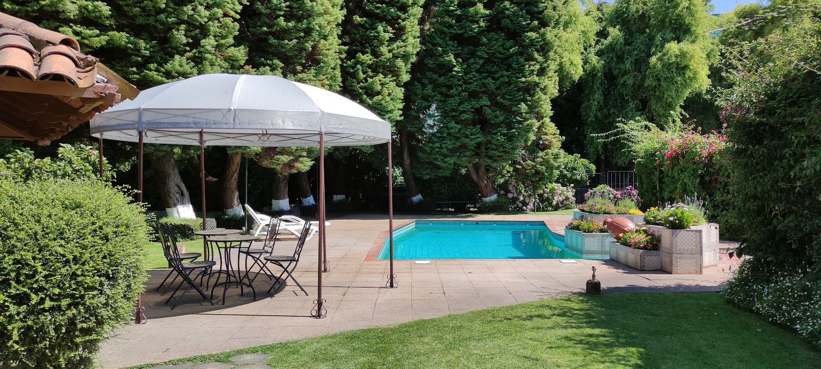 An outdoor pool is flanked by a furnished gazebo and a garden. BBQ facilities are available. There’s also a casual restaurant and a bar. A cozy lounge provides plush seating. Parking is available.